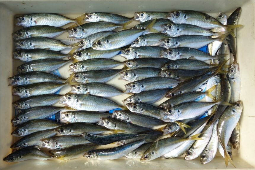 サビキ釣りでアジが良く釣れています!時々ウルメイワシも釣れています!