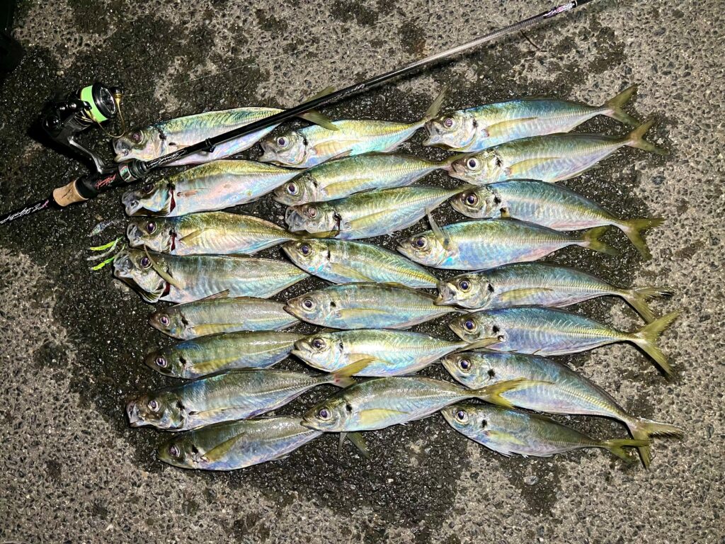 尺アジフィーバーです。写真でサイズ感が伝わらないのが残念ですが全て28~32㎝の良型アジ旗です。