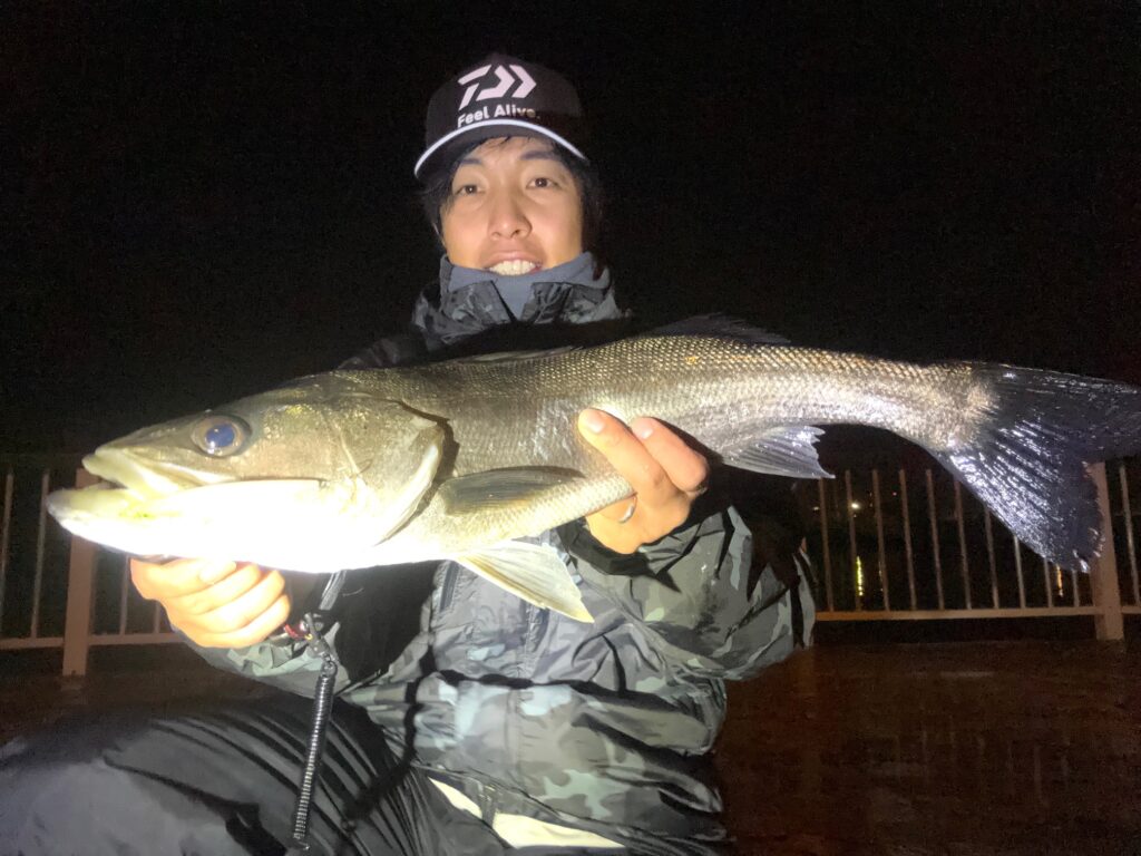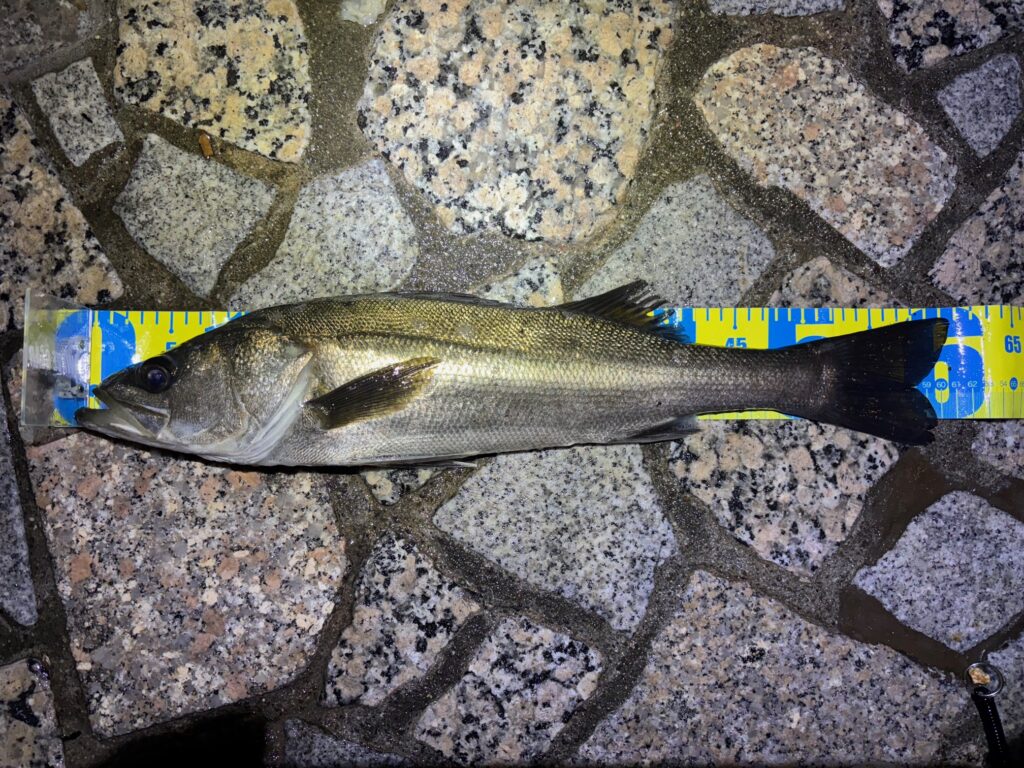 真鯛が釣れるとの事で仕事終わりに行ってみれば生憎の天気…雨模様だと真鯛が出ずらいらしくそれでもメバルを釣りながら粘っていると良いサイズのシーバスゲット!!満足です!!