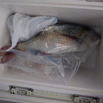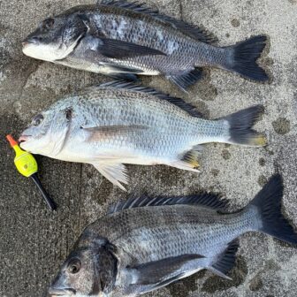 蒲刈の地磯にてチヌ2匹とキビレ1匹。渋い状況ながら、良型混ざりで釣れています。底ギリギリで釣れることがおおく、むき身(むきえもん)も反応が良いとの事。