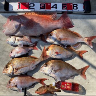 40㎝までの真鯛が一人7匹の釣果です。釣法は一つテンヤで、8号~10号のテンヤを使用。テンヤはタングステンの方が良いです。