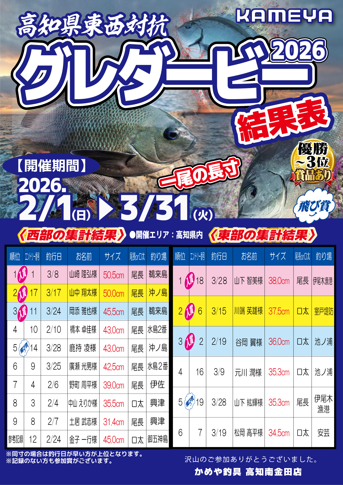 東西それぞれ上位3名様には賞品が、5位の方には飛賞があります‼️たま、惜しくも入賞出来なかった方や記録のない方にも参加賞を用意しておりますのでお時間ございましたらぜひかめや釣具高知南金田店へ‼️
