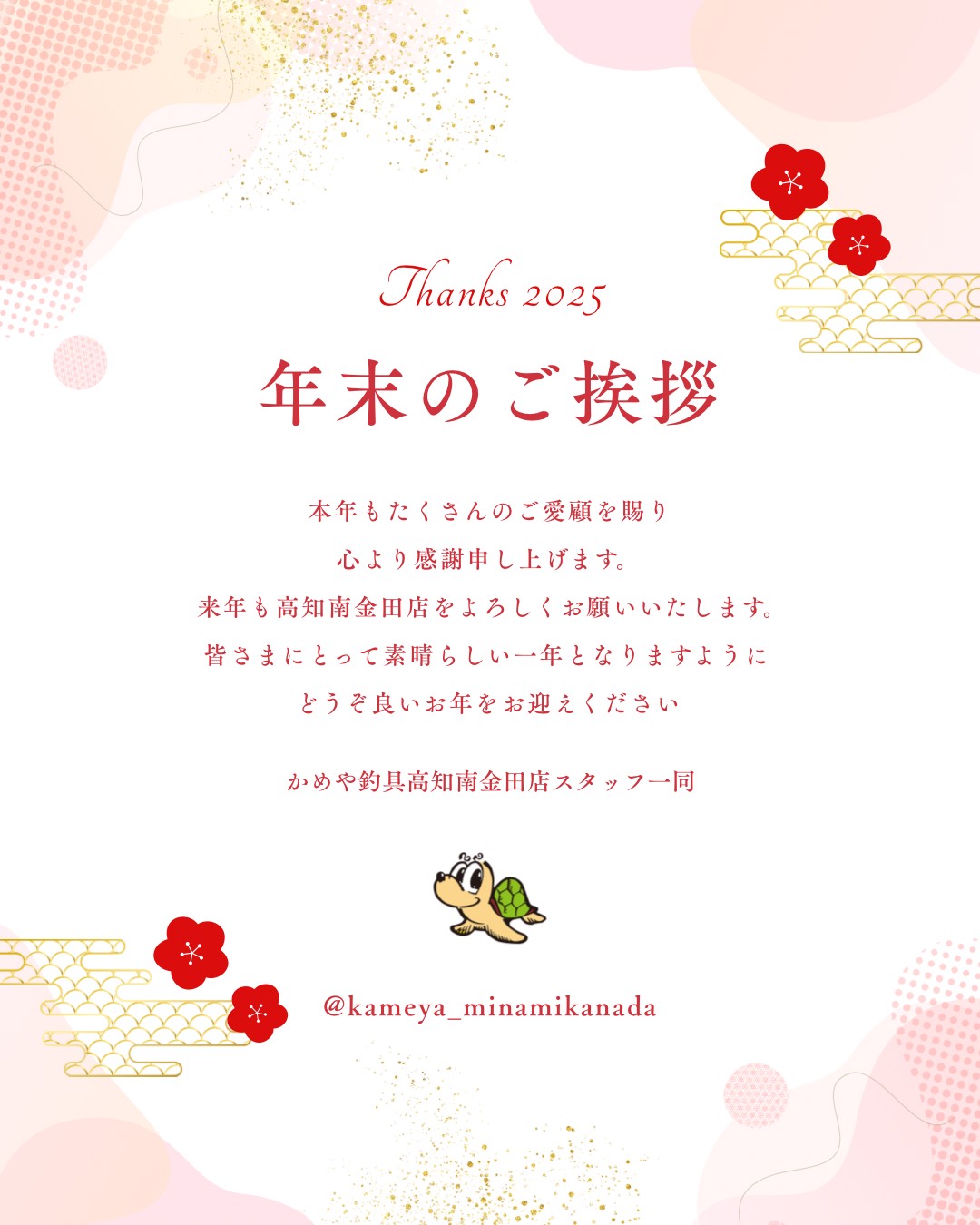 今年もありがとうございました!🐢南金田店、高知県 こんにちは~(‘ω’)ノかめや釣具高知南金田店です 2025年も多くのお客様にご利用いただきスタッフ一同心より感謝申し上げます!! 今年は皆様どんな魚に出会えましたか? スタッフなおえはあっという間の一年、振り返ると楽しいことが色々とありました…(゜o゜) 白甘鯛釣行中、ポンポン釣れ始めたぞ!とフィーバータイムに入るも突然の大雨に降られ震えながら続行したり、 イカメタルにてフィーバータイム中に自分だけサバから猛アピールをもらい… (楽しかったのか?)な思い出が昨日のようです(゜o゜) そんなこんなで高知南金田店スタッフ一同は2026年も皆様を全力でサポートいたしますので、変わらぬご愛顧のほどよろしくお願いいたします☆ また、明日1/1(木)も9時~18時まで元気に営業しておりますお待ちかねの福袋も同時に販売開始ですよ!!!!(^J^) 皆様のご来店を心よりお待ちしております(*‘ω‘ *)それでは皆様よいお年を~~~~🐢🐢🐢 南金田店 TEL.088-883-1091 店舗案内 イベント 大会 SALE