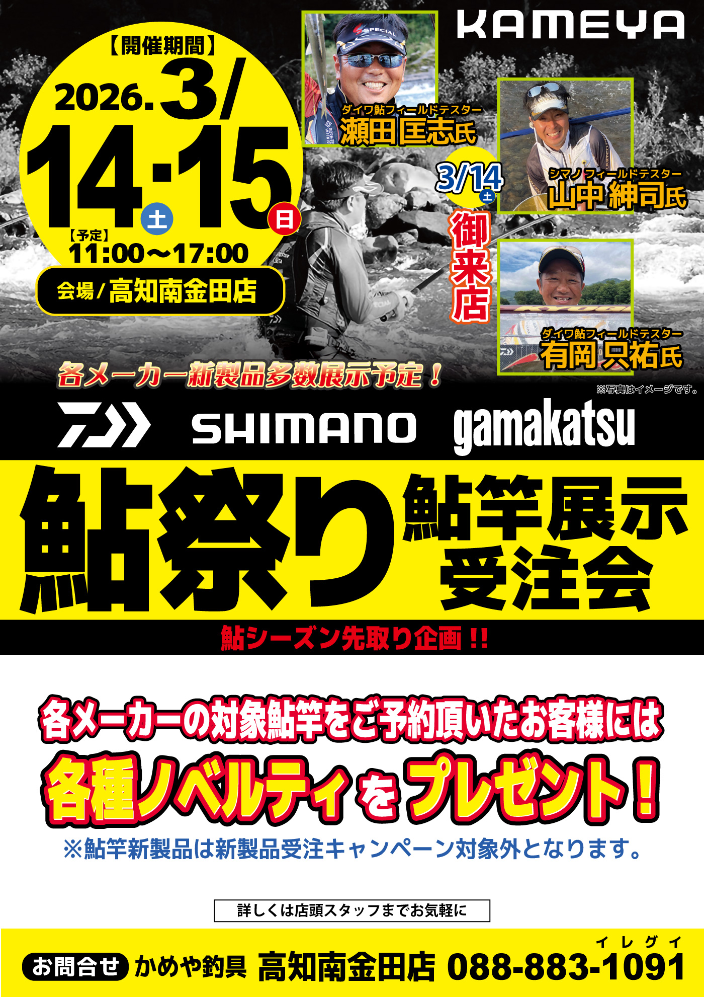 今月14、15日は鮎祭り南金田店、高知県 かめや釣具高知南金田店で3月14、15日に鮎竿展示受注会を開催いたします各メーカー話題の新製品を多数展示予定(゚∀゚)さらに14日にはスペシャルゲストに御来店いただきます・ダイワ鮎フィールドテスター 瀬田 匡志氏・ダイワ鮎フィールドテスター 有岡 只祐氏・シマノフィールドテスター 山中 紳司氏スペシャルゲストの方々に鮎竿についてだけでなく、鮎友釣りのコツ等も聞けるチャンスです(`・∀・´)さらに鮎竿だけでなく、鮎釣り用品も多数展示予定ですので、この機会をぜひお見逃しなく皆さまのご来店、お待ちしております 南金田店 TEL.088-883-1091 店舗案内 イベント 大会 SALE