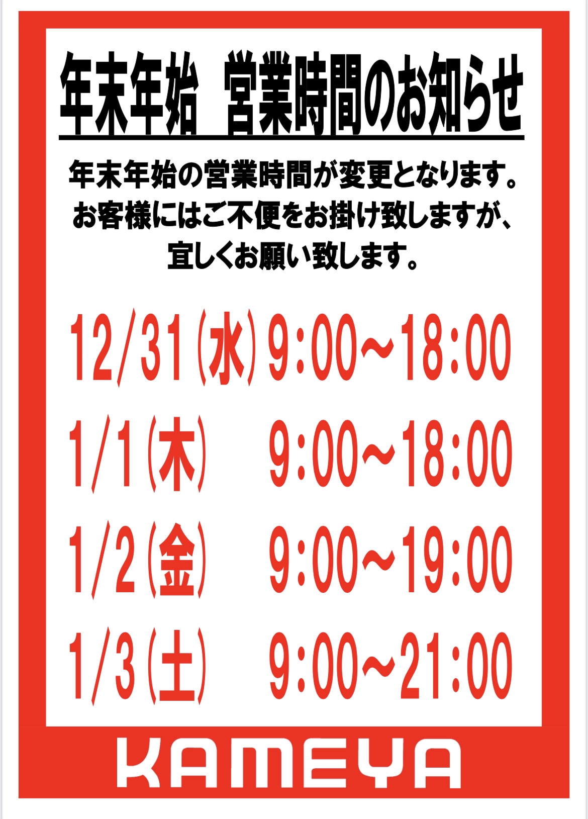 年末のご挨拶香川県、高松屋島店 いつもかめや釣具をご利用頂き誠にありがとうございます。早いもので、本年も残すところあとわずかとなりました。本年は特段のご高配を賜り、厚くお礼申し上げます。来年もご期待に添えるよう誠心誠意努めていく所存ですので、来年も変わらぬご愛顧のほどよろしくお願い申し上げます。なお、当店の年末年始営業時間は下記の通りです。2025年12月31日(水)9:00~18:002026年1月1日(木)9:00~18:002026年1月2日(金)9:00~19:002026年1月3日(土)9:00~21:002026年1月4日(日)9:00~20:00ご不便をおかけしますが、何卒ご理解賜りますようお願い申し上げます。簡単ではございますが、年末のご挨拶とさせていただきます。どうぞ良いお年をお迎えください。 高松屋島店 TEL.087-843-9141 店舗案内 イベント 大会 SALE
