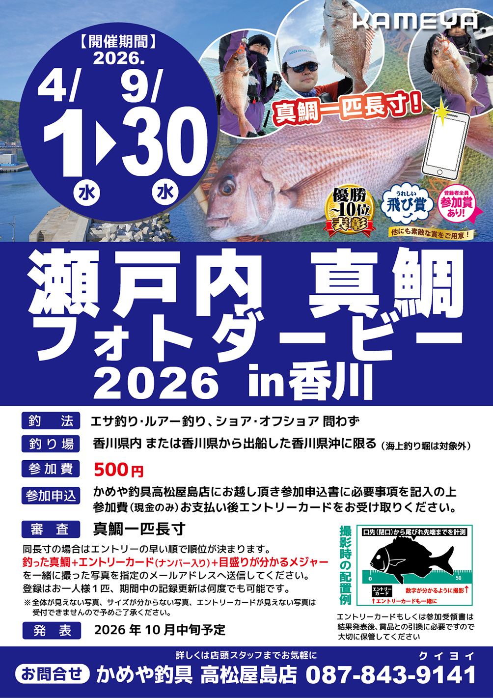 真鯛フォトダービー開催中!香川県、高松屋島店 皆様こんにちは!かめや釣具高松屋島店です! 暖かくなって参りましたが皆様釣り行かれておりますか?(*^^) 最近久しぶりに沖堤防へフカセ釣りへ行って参りましたが 真鯛・黒鯛共にのっこみシーズンに入った感じです(^^♪ さてそんな鯛釣り好調シーズンに向けて当店では、「瀬戸内真鯛フォトダービー」を開催しております!! 参加費は500円、1匹長寸で競い合います! 一度登録すれば何度でも更新可能!9月いっぱいまで期間がございますので、皆様是非是非ご参加下さいませ!ご不明な点ございましたらお気軽にスタッフまで! 皆様のご参加、ご来店お待ちしております!! 高松屋島店 TEL.087-843-9141 店舗案内 イベント 大会 SALE