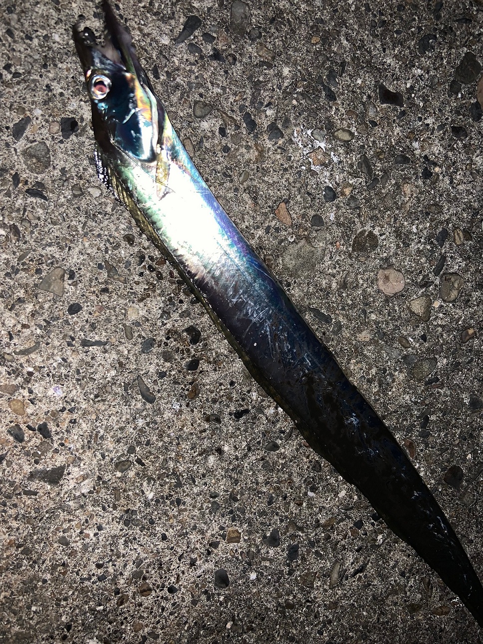 ジグ単で表層を探っていると、かわいいサイズのタチウオ。