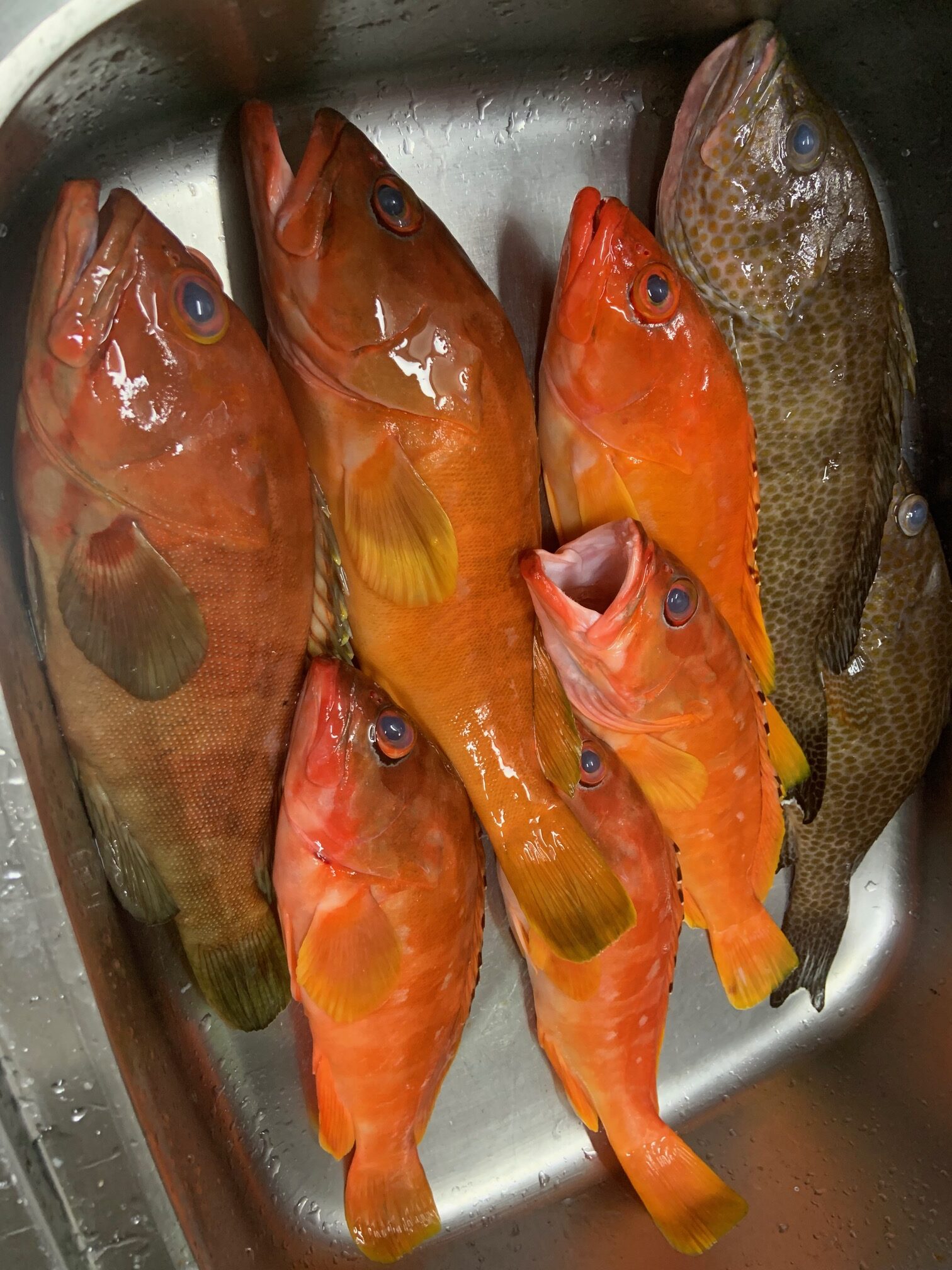 40~60gまでのジグヘッド、テキサスリグでボトムを丁寧に探っていくとアカハタが連発!
