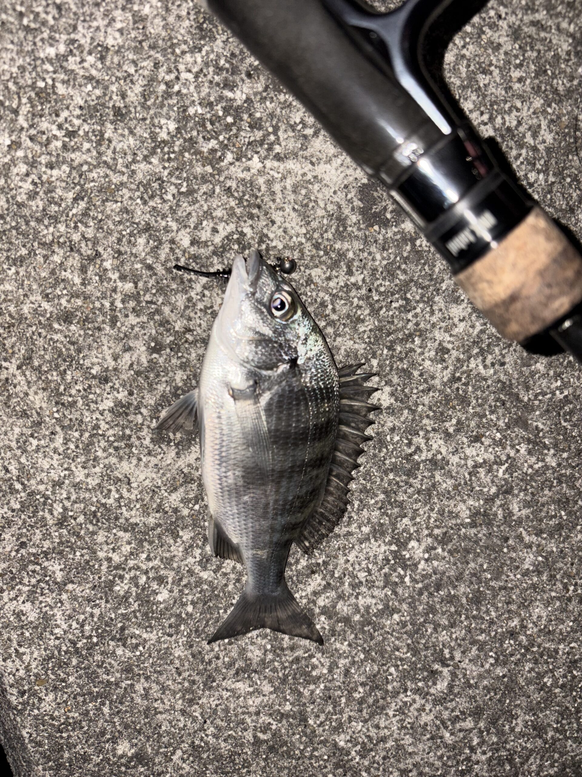 タングステンジグヘッド1gに小さめのワームで小さいチヌが釣れました。